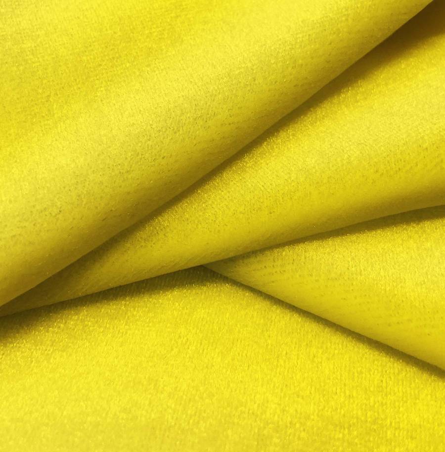 La tela base utilizada en este caso es el Terciopelo Retro - Paris, con una composición de 93% poliéster y 7% elastano, lo que le proporciona una textura suave y elástica. El color liso impreso es Amarillo huevo, con una combinación de tintas de Cyan: 0, Magenta: 16, Yellow: 91, y Black: 0, que resulta en un tono brillante y cálido. Este color combina especialmente bien con tonos neutros como blanco, beige y gris.