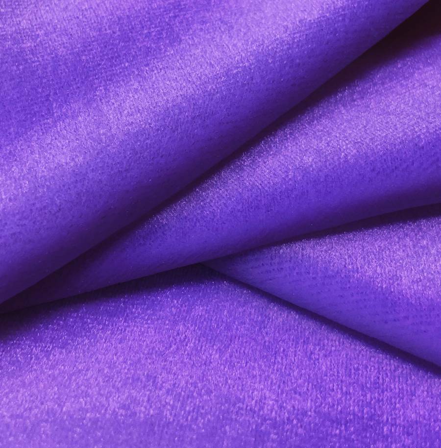 La tela base, Terciopelo Retro - Paris, es un suave y brillante terciopelo de poliéster-elastano en tonos azul y violeta claro, con un CMYK de 78 78 0 0. Este color secundario combina perfectamente con colores neutros como blanco, beige, gris y negro, resaltando su luminosidad y elegancia.