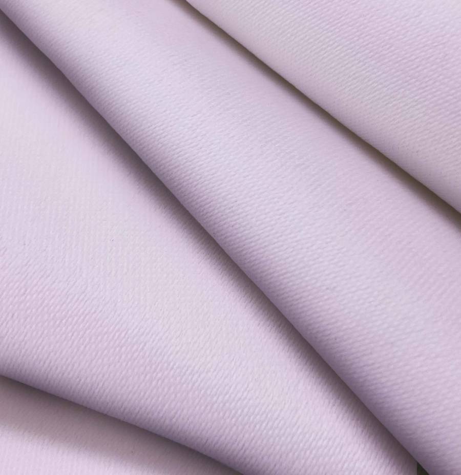 La tela base es Lona Oscurante - White Out, de color morado y malva con un CMYK de 24 35 4 0. Este color simboliza la creatividad, la espiritualidad y la transformación, combinándose con tonos como el blanco, el gris y el rosa para resaltar su luminosidad.