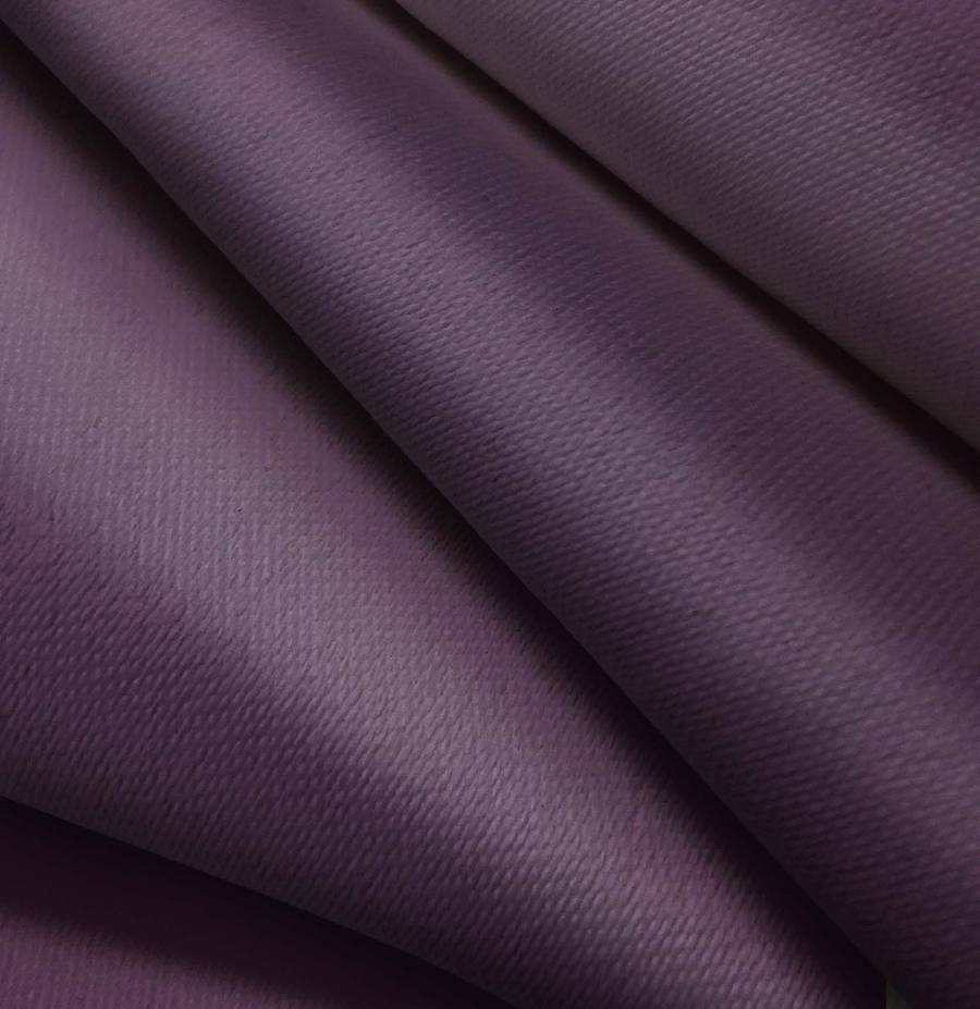La tela base es una Lona Oscurante de color blanco, con un color liso impreso de tono Morado Oscuro, reflejando un CMYK de 71 87 42 51. Este color se caracteriza por su intensidad y profundidad, combinando muy bien con tonos neutros como el blanco, negro o gris, así como con colores complementarios como el amarillo o el verde.