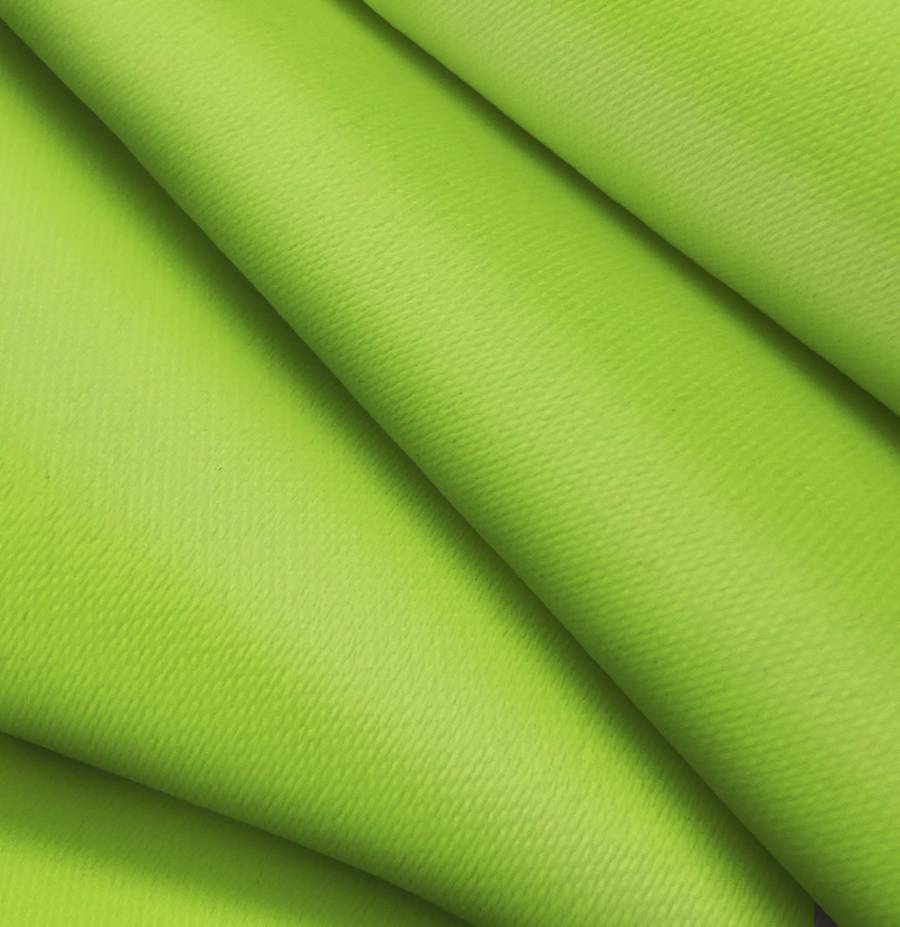 La tela base es una Lona Oscurante de color blanco, con un tono verde cebolla impreso. La tonalidad se logra con una combinación de tinta Cyan (56%), Magenta (9%), Yellow (94%) y Black (1%), reflejando un CMYK de 56 9 94 1.