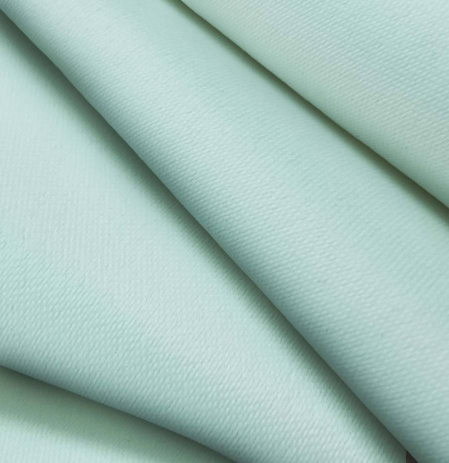 La tela base, Lona Oscurante - White Out, es de color liso Verde Menta según el CMYK proporcionado (43, 8, 29, 0). Se trata de un color refrescante y suave, que transmite tranquilidad y armonía. Combina especialmente bien con tonos neutros como blanco, gris y beige, pero también con colores pastel como el rosa o el azul claro.