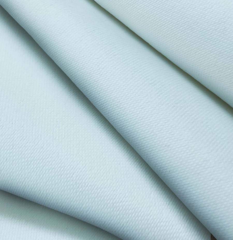 La tela base, Lona Oscurante - White Out, es un tejido técnico de poliéster con un gramaje de 218 gr/m2, de color blanco impreso en un tono azul claro con CMYK 36 7 10 0. Este color segundario es suave, fresco y relajante, y combina bien con tonos neutros y tierra.