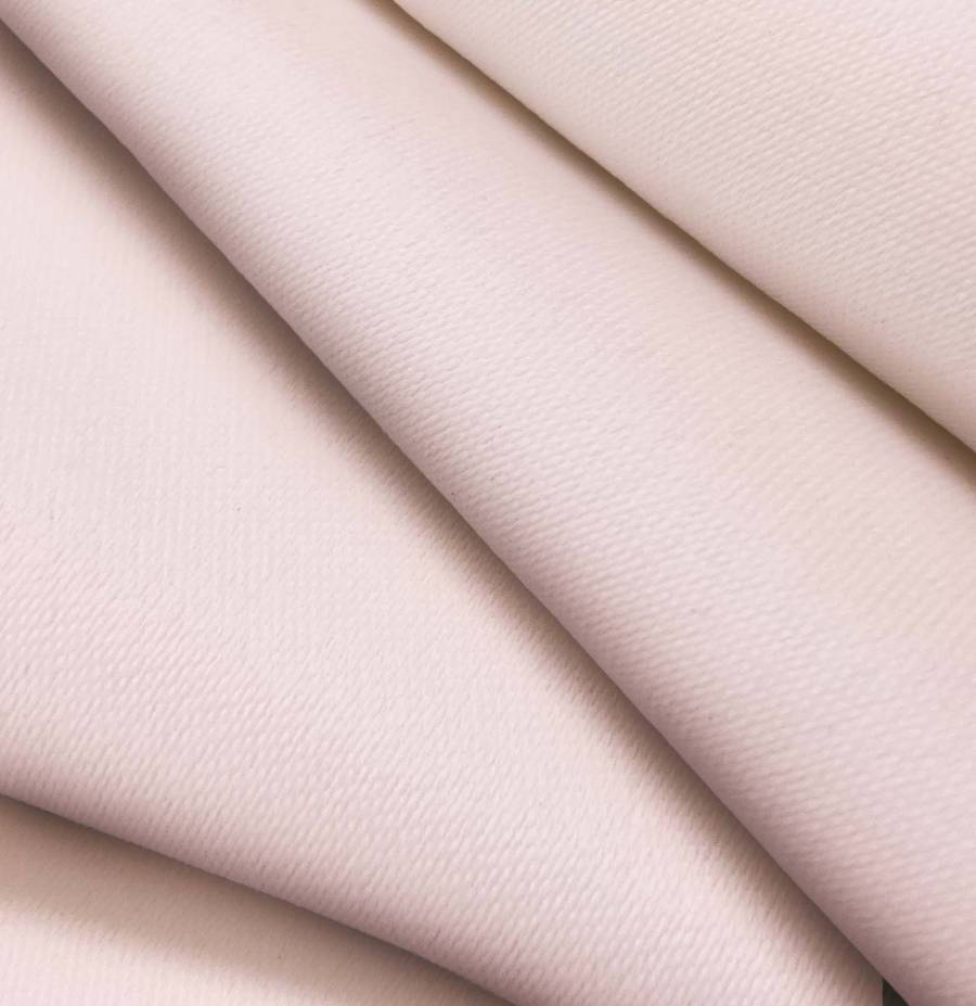 La tela base, Lona Oscurante - White Out, es un tejido técnico de poliéster con un gramaje de 218 gr/m2 y un ancho de 160 cm, de color liso impreso en tono rosa cuarzo, con un CMYK de 1 28 16 0. Este color simboliza la sensibilidad y la compasión, ideal para transmitir calidez y ternura. Combina especialmente bien con colores neutros como blanco, gris y beige, así como con tonos más intensos como el azul marino o el verde oscuro.