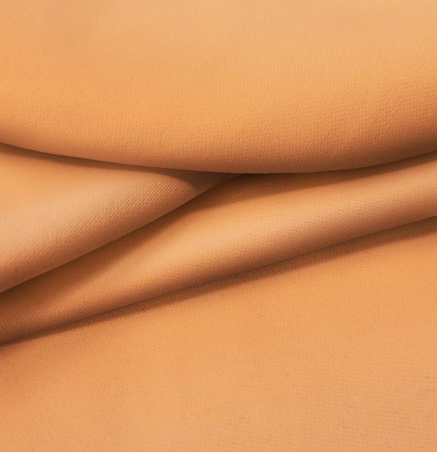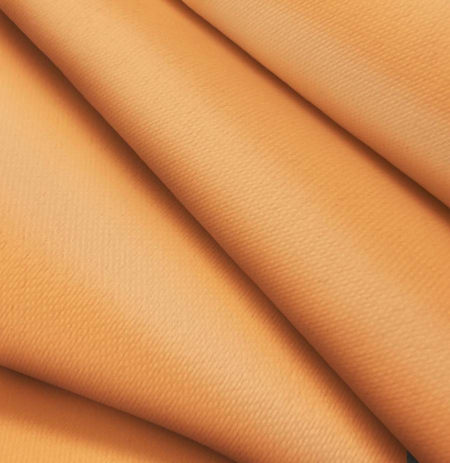 La tela base, Lona Oscurante - White Out, es un tejido técnico de poliéster con un gramaje de 218 gr/m2 y un ancho de 160 cm. El color impreso es Naranja-Cáscara de huevo, con una combinación CMYK de 1 57 71 0, que se destaca por su tono cálido y vibrante, con matices suaves y elegantes que combinan especialmente bien con tonos neutros y tierra.