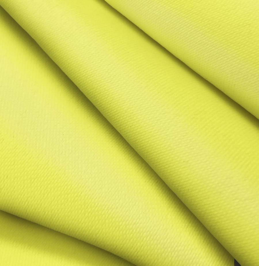 Las características de la tela base incluyen una textura lisa, rígida y opaca. Es un tejido técnico de 100% poliéster, con un gramaje de 218 gr/m2 y un ancho de 160 cm. El color impreso Amarillo Fulminante añade un toque vibrante a la tela, lo que la hace ideal para aplicaciones de decoración y moda.