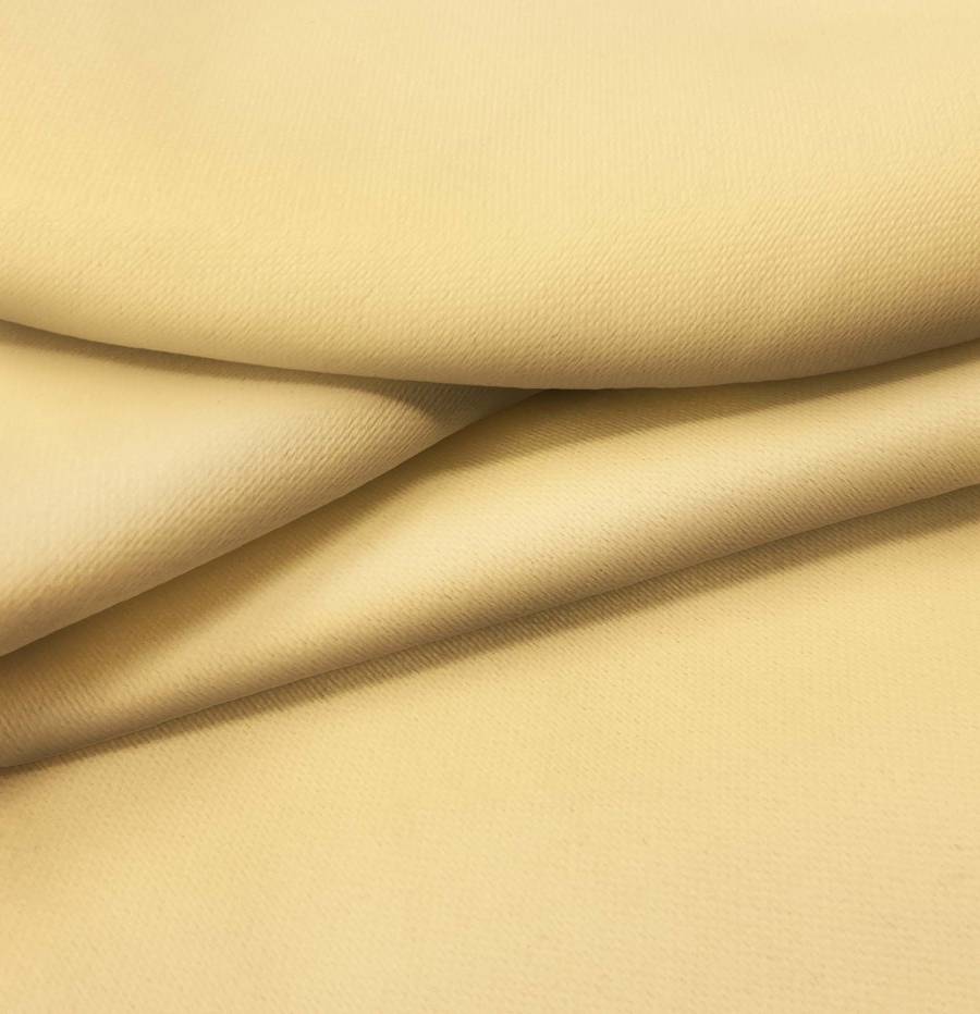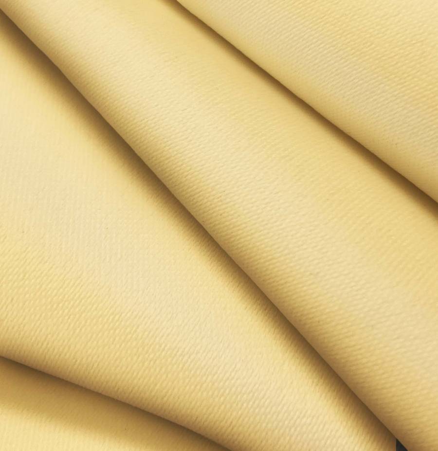 La tela base es la Lona Oscurante - White Out, con un color liso impreso en amarillo macarrón, reflejando un CMYK de 0 27 58 0. Este color simboliza la energía, la creatividad y la alegría, combinando especialmente bien con tonos neutros como gris, blanco y beige.