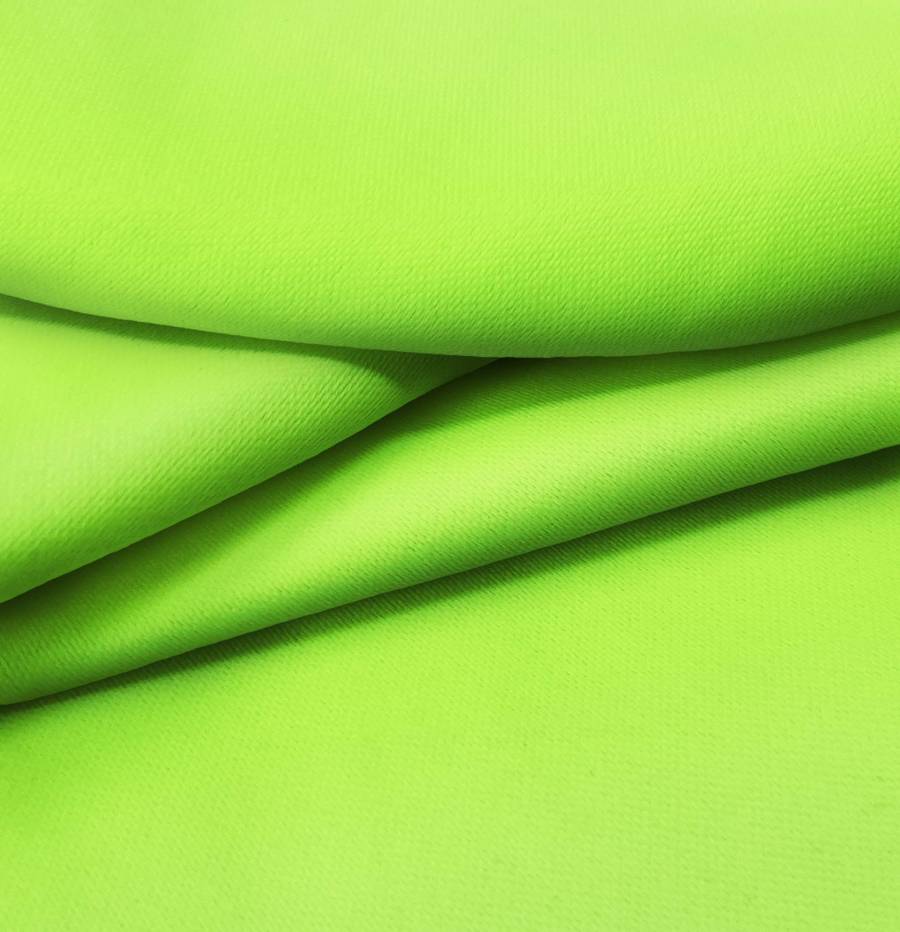 La tela base está impresa con el color verde lima a una sola cara por impresión digital textil. La textura de la tela es lisa y rígida, con un tacto suave. El color impreso es opaco, lo que le da una apariencia sólida y vibrante.