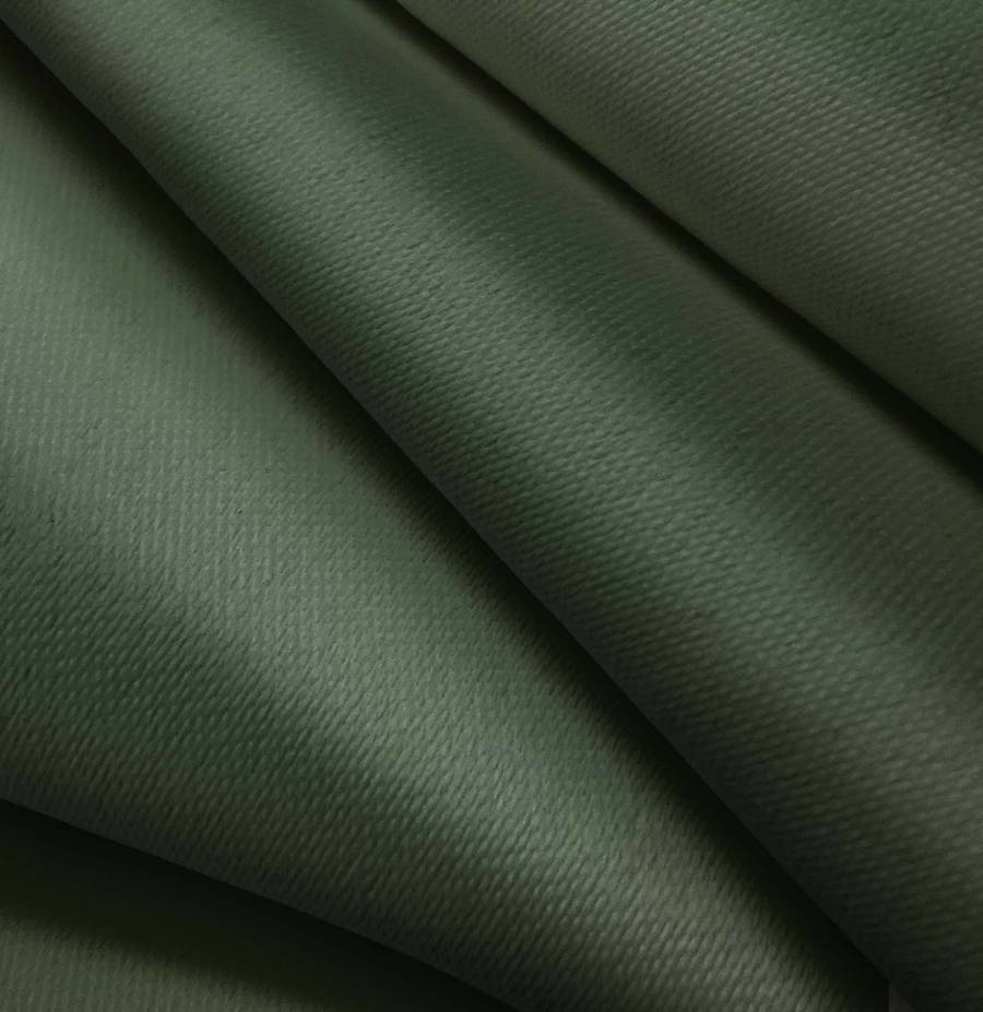 La tela base es una lona oscurante de tipo tejido técnico, compuesta al 100% de poliéster, con un gramaje de 218 gr/m2 y un ancho de 160 cm. El color liso impreso es un verde Monte, con una combinación de tintas Cyan: 75, Magenta: 53, Yellow: 80, Black: 64 y un CMYK de 75 53 80 64.