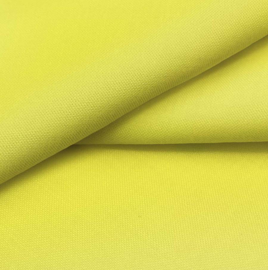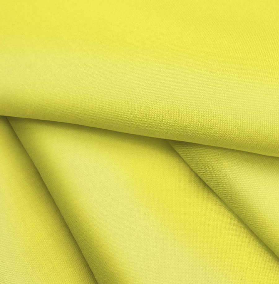 La tela base Voile Ligero - Kyoto es un poliéster suave y translúcido de color amarillo canario, con un CMYK de 9 0 81 0. Este color transmite alegría y energía, complementándose con tonos neutros como blanco, negro y gris, así como con colores más vibrantes como naranja, verde y azul.