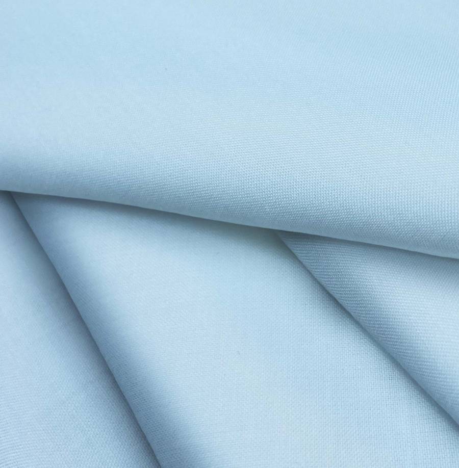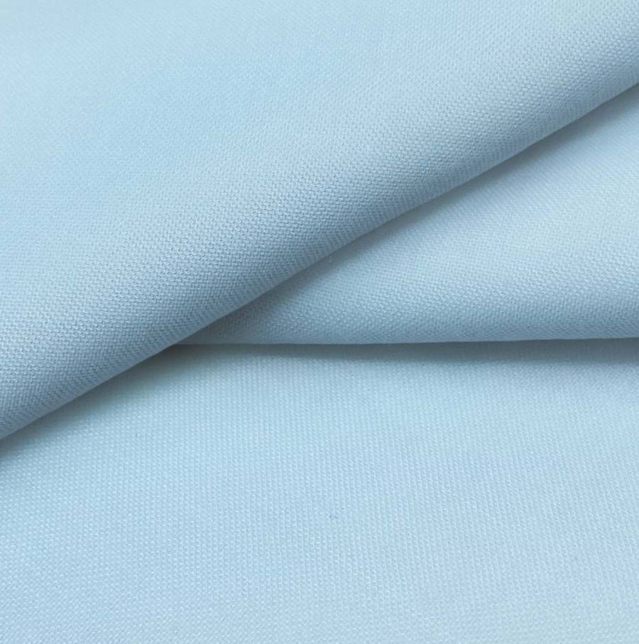 La tela base, Voile Ligero - Kyoto, es de poliéster con un gramaje de 79 gr/m2 y un ancho de 148 cm. El color liso impreso es Azul Agua, con un CMYK de 40 8 2 0, que combina perfectamente con tonos neutros como blanco y gris.