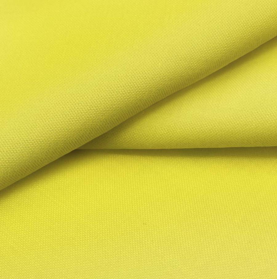 La tela base, Voile Ligero - Kyoto, es un tejido de poliéster ligero y translúcido que presenta un color liso impreso en tonos amarillos y azufre, con un CMYK de 10 6 84 0. Este color secundario simboliza la energía, la creatividad y la alegría, y combina perfectamente con tonos neutros como el blanco, el gris o el negro para crear contraste y equilibrio en la decoración textil.