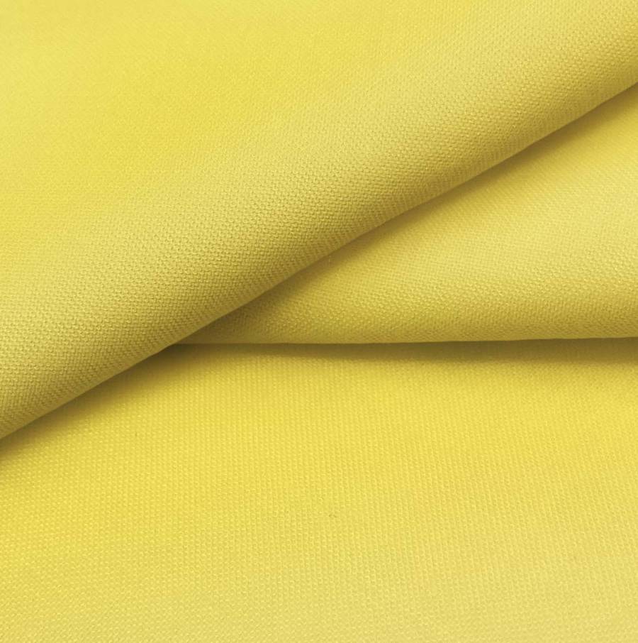 La tela base de Voile Ligero - Kyoto es de color amarillo intenso, con una composición de 100% poliéster y un gramaje de 79 gr/m2. El color liso impreso tiene un CMYK de 0 16 77 0, lo que indica una predominancia de tonalidades amarillas y magentas. Este color refleja calidez, energía y vitalidad, y combina perfectamente con colores como el blanco, gris y azul marino.