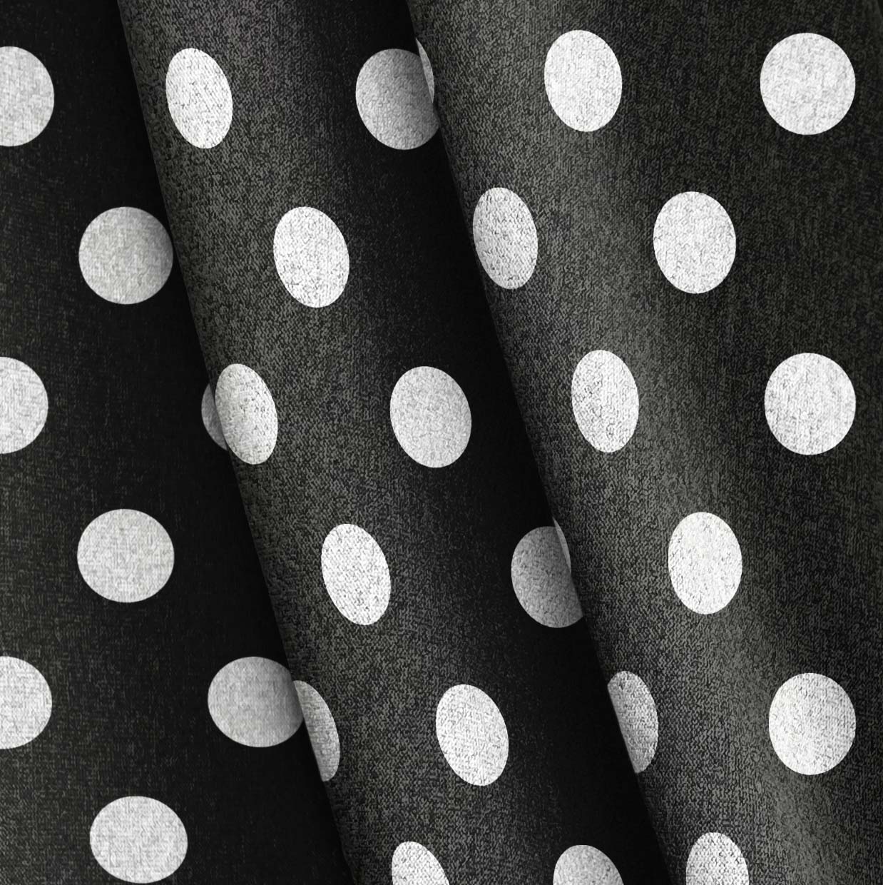 La tela base es el Tejido Transpirable - Fresh Belice, compuesta por 100% poliéster y con un gramaje de 140 gr/m2. Su ancho es de 160 cm y su tecnología de impresión es la sublimación (poliéster). El diseño estampado se compone principalmente de círculos y lunares en los colores negro noche, blanco algodón y morado oscuro. Este diseño aporta una textura jaspeada y opaca a la tela, creando un contraste de tonalidades muy atractivo. Además, podría combinarse con colores lisos como el blanco, negro, morado o incluso un amarillo suave.