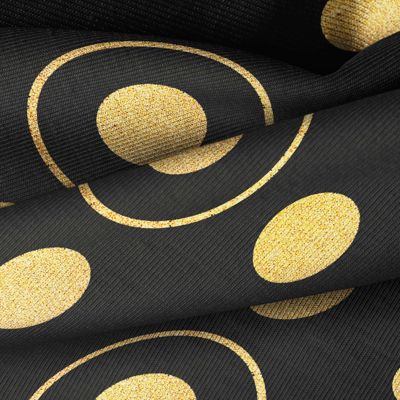 La tela base es la Gasa Transparente - Salamanca, un tejido suave, ligero y transparente de 100% poliéster con un gramaje de 28 gr/m2 y un ancho de 150 cm. El diseño estampado combina círculos y lunares en colores principales como el Negro Noche, Amarillo Mostaza y Naranja Claro. Esta tela impresa a una sola cara por impresión digital textil tiene una textura visual transparente y un tacto delgado. Combina muy bien con colores lisos como blanco, gris, rosa y azul claro.