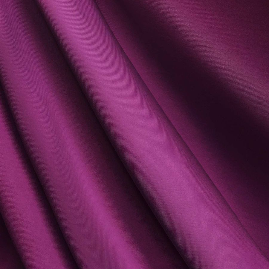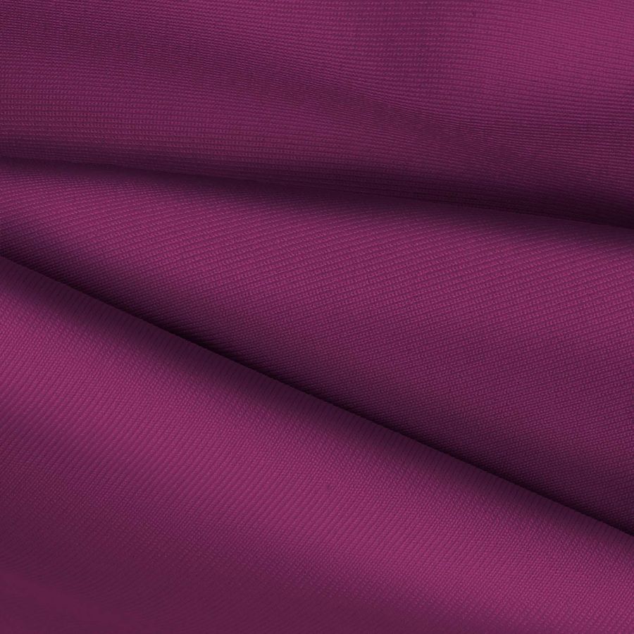 La tela base es una Lycra de Poliéster Nairobi de 270 gr/m2 con composición de 82% POLIÉSTER y 18% ELASTANO. El color liso impreso es de un tono Morado Berenjena con un CMYK de 53 99 25 18. El color secundario es un tono oscuro con mucha profundidad, inspirando misterio e intensidad en su presencia. El Morado Berenjena combina perfectamente con otros tonos como el Rosa, el Oro, el Blanco y el Gris, logrando una combinación armónica y sofisticada.