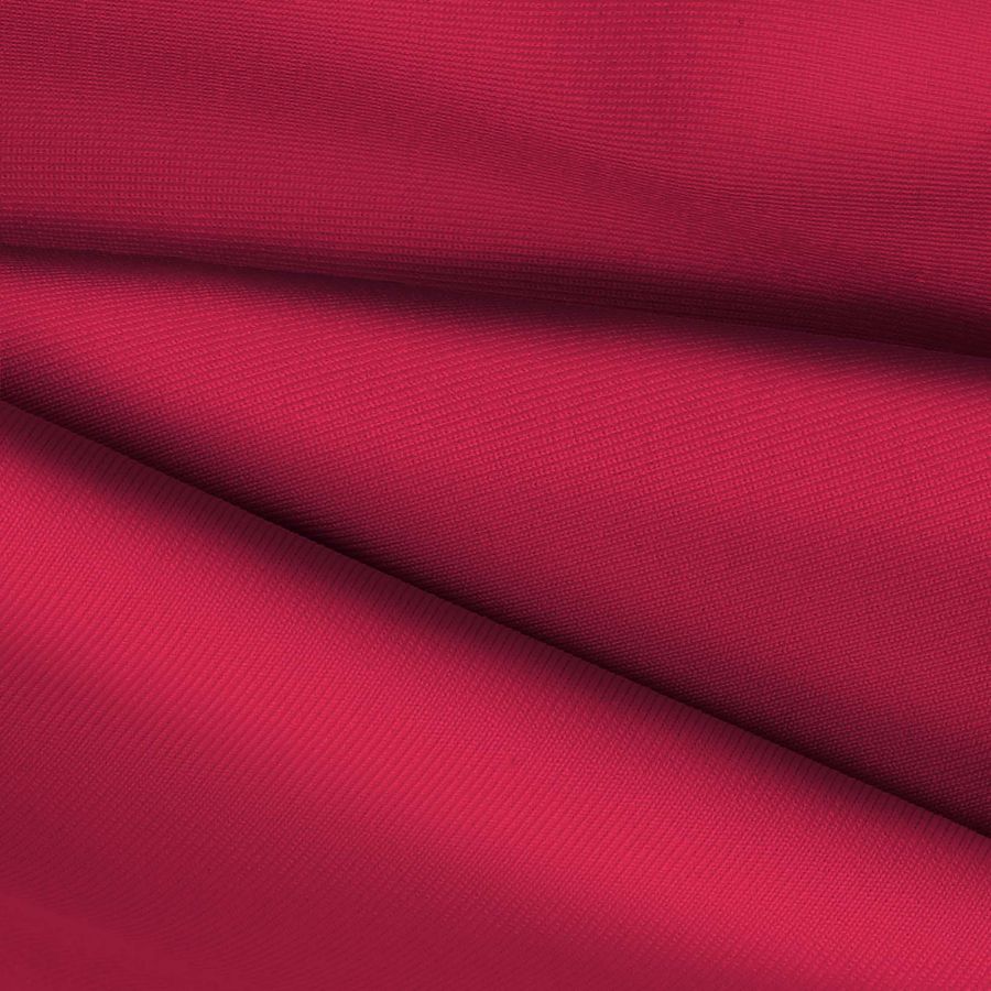 La tela base es Lycra de Poliéster - Nairobi de 270 gr/m2, con una composición del 82% de poliéster y 18% de elastano. El color liso impreso es un Rojo Granate brillante, con un CMYK de 18 100 58 8. Este color secundario tiene una fuerte personalidad y simboliza la pasión y la fuerza. Combina bien con el blanco, negro y gris, así como con tonos cálidos como naranja, amarillo y marrón.