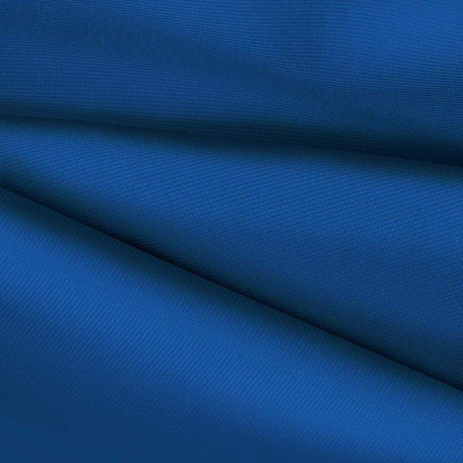 La tela base es una Lycra de Poliéster Nairobi de 270 gr/m2 que cuenta con una composición de 82% poliéster y 18% elastano. Su ancho es de 150 cm y no se recomienda blanquearla. El color liso impreso en esta tela es un tono de azul medio con un CMYK de 97 67 13 2 y se imprime digitalmente en una sola cara. Este color es simbólicamente asociado con la paz, la tranquilidad y la confianza. Además, combina muy bien con tonos de amarillo y verde.