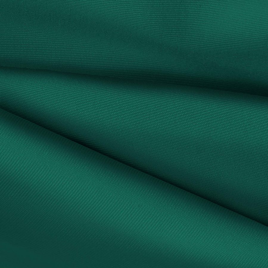 La tela base es Lycra de Poliéster - Nairobi, de 270 gr/m2, con una composición de 82% poliéster y 18% elastano. El color liso impreso tiene un CMYK de 89 35 67 29, lo que se traduce en un verde mar profundo. El color es simbólico de la tranquilidad del océano y la profundidad del mar, mientras que el uso del verde se asocia con la naturaleza y la frescura. El verde mar profundo combina muy bien con tonos de gris, azul-platino, marrón y amarillo mostaza. La tela está impresa a una sola cara por impresión digital textil.
