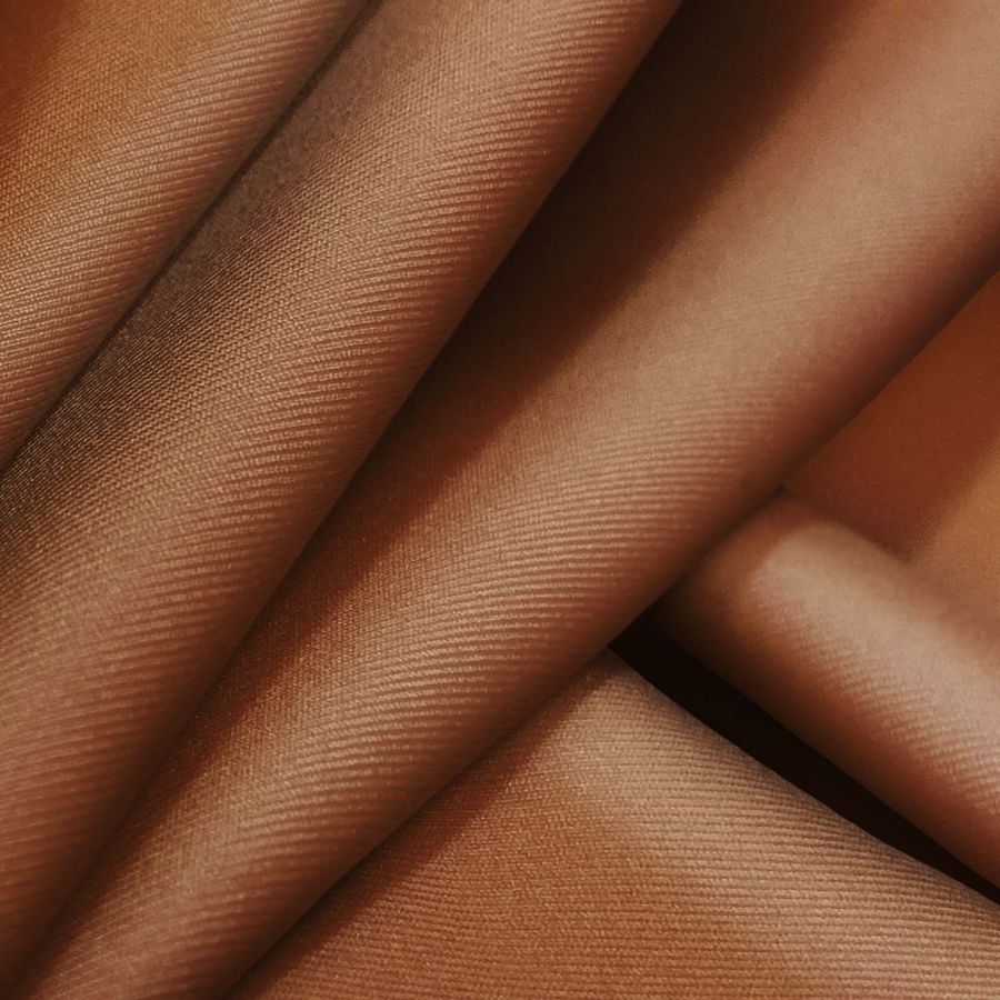 La tela base de este tejido es la Lycra reciclada de 190 gr/m2 en un ancho de 150 cm. Su composición es de 85% poliéster y 15% elastano, y cuenta con una certificación GRS de reciclados. El color liso impreso es de marrón sillín, representado por un CMYK de 33 67 83 38. Este color elegante y sofisticado tiene un matiz cálido y se combina a la perfección con tonos tierra, amarillos y verdes apagados.