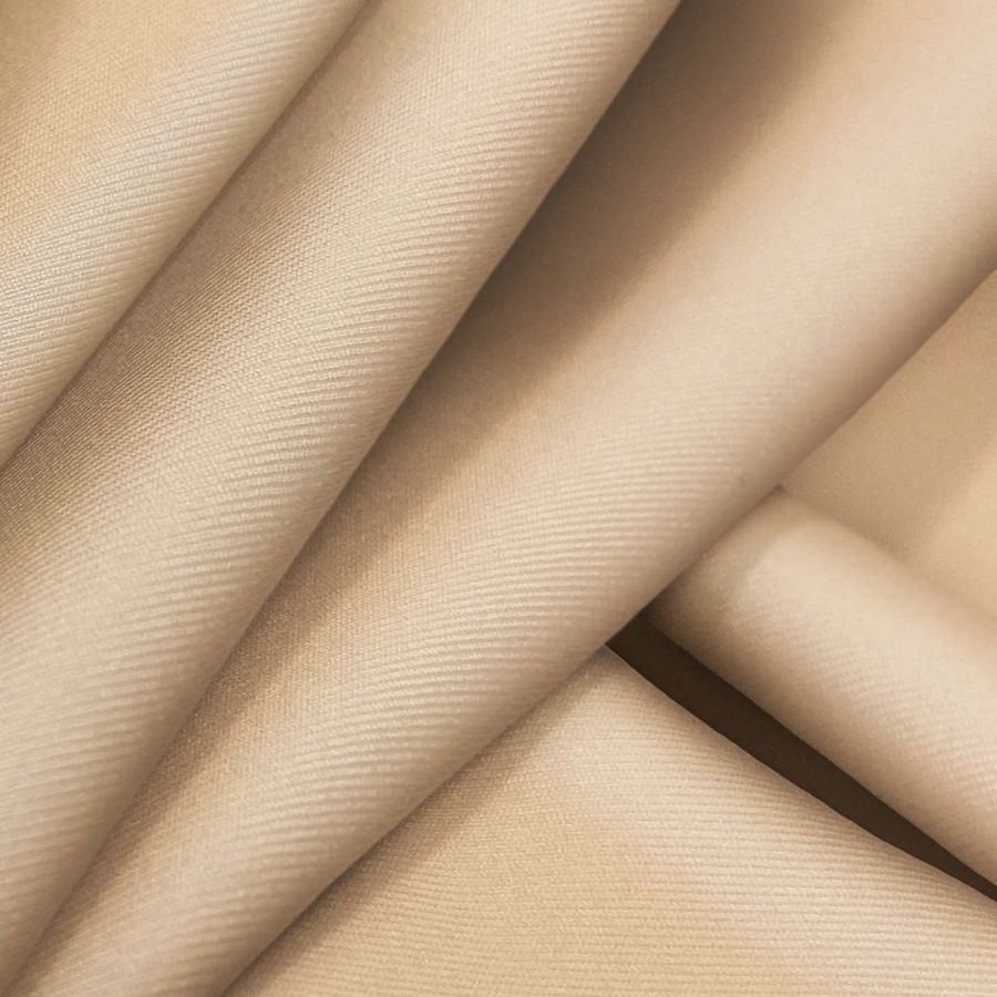 La tela base es Lycra Reciclada - Recycled de 190 gr/m2, una lycra compuesta por 85% poliéster y 15% elastano, con un gramaje de 190 gr/m2 y un ancho de 150 cm. El color secundario es Marron Azúcar Morena, con un CMYK de 10 34 48 2. Este tono ofrece una sensación de calidez y dulzura, a la vez que se percibe como un color natural y terroso. Puede combinarse con tonos de verde oscuro, beige, marrón chocolate, rosa empolvado y dorado, entre otros. Es importante destacar que esta tela está impresa con el color liso a una sola cara por impresión digital textil, por lo que su aspecto varía según el ángulo desde el que se mire.