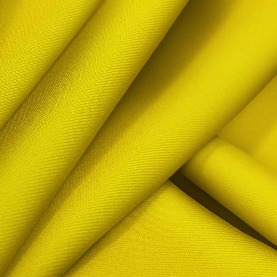 La tela base es Lycra Reciclada de 190 gr/m2 en amarillo profundo con CMYK de 13 25 96 2. Este color evoca la energía y vitalidad del sol. Combinado con tonos tierra o neutros, crea armonía y elegancia en el diseño. La tela está impresa con el color liso a una sola cara, por impresión digital textil, lo que garantiza una alta precisión y calidad de los detalles. La Lycra Reciclada es un tejido elástico, suave y resistente, que proporciona gran movilidad y comodidad en cualquier actividad.