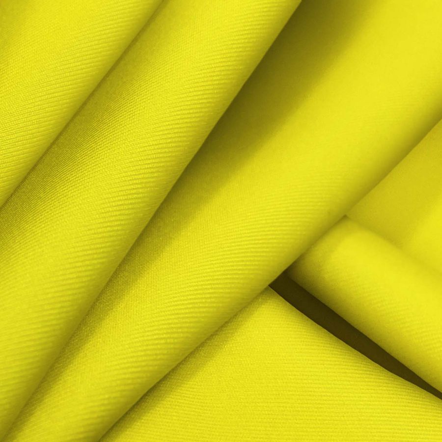 La tela base es Lycra Reciclada - Recycled de 190 gr/m2 en color liso Amarillo canario, con un contenido de tinta Cyan del 6%, Magenta 0%, Yellow 89% y Black 0%, según el CMYK de la tinta impresa. El color secundario del amarillo canario es el verde lima, que combina armoniosamente con tonalidades rosadas y anaranjadas.
