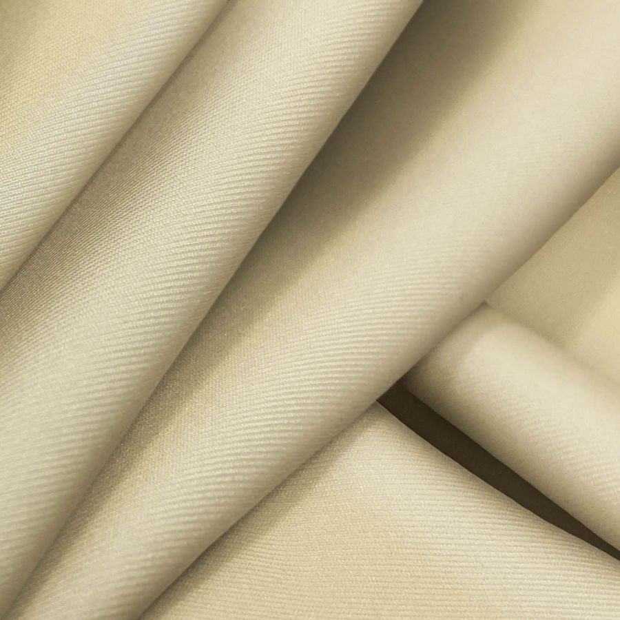 La tela base es Lycra Reciclada - Recycled de 190 gr/m2, una tela sostenible y suave al tacto gracias a su composición de 85% poliéster y 15% elastano. El color liso impreso es Amarillo-Beige francés claro con una combinación de CMYK de 15 20 47 2. Este color tiene una simbología de alegría y energía, ideal para prendas deportivas y de baño. Combina especialmente bien con el color negro y otros tonos tierra.