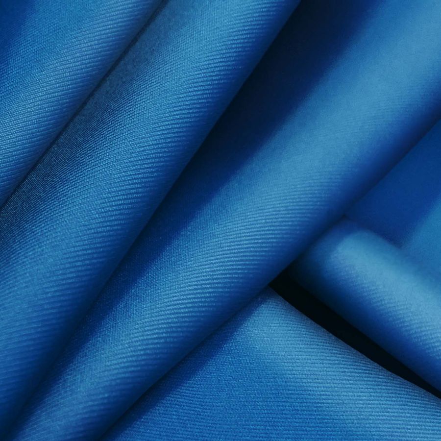 La tela base es Lycra Reciclada - Recycled de 190 gr/m2 en color azul medio, con una composición de 85% de poliéster y 15% de elastano. El color liso impreso se obtiene por sublimación y su CMYK es 97 67 13 2. El color azul medio transmite tranquilidad y serenidad, es fácil de combinar con otros colores como el blanco y el amarillo para apariencias suaves, mientras que los colores más fuertes como el rojo y el negro también se combinan muy bien.