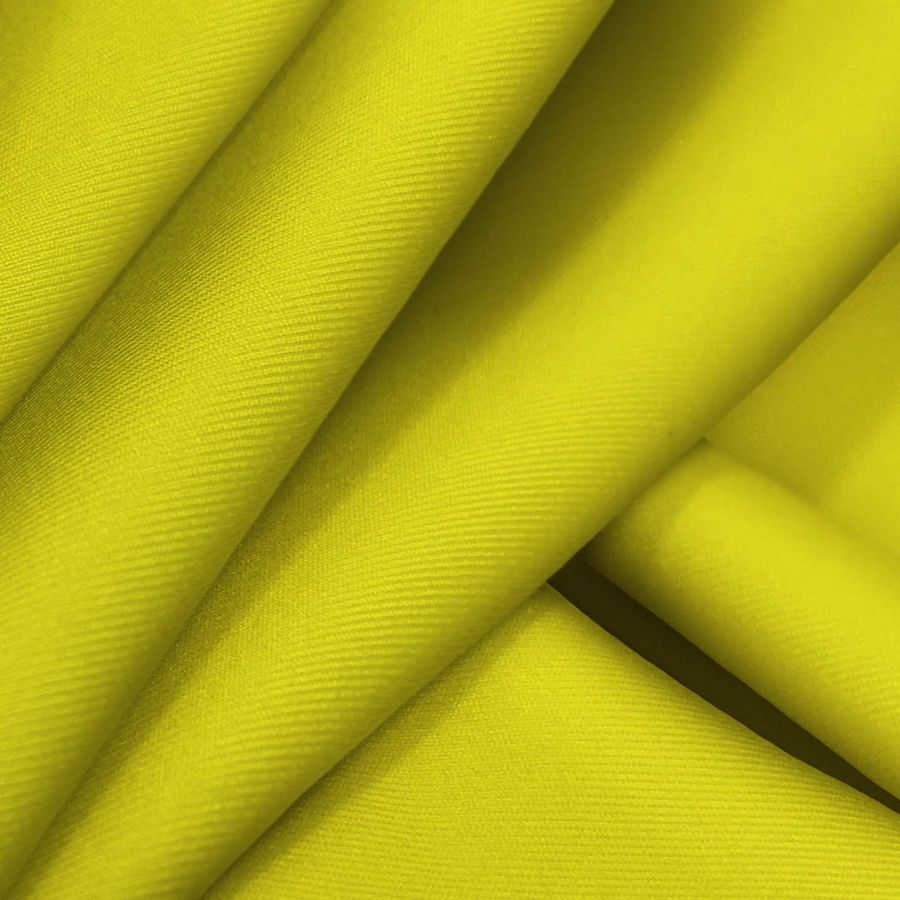 La tela base es la Lycra Reciclada - Recycled, compuesta por 85% poliéster y 15% elastano, con un gramaje de 190 gr/m2 y un ancho de 150 cm. Su color liso impreso es un verde ácido con un CMYK de 27 15 97 2. Este vibrante color secundario combina muy bien con tonos azulados y rosados, y proporciona un gran contraste para resaltar cualquier diseño impreso. Cabe destacar que la tela está impresa con el color liso a una sola cara por impresión digital textil.