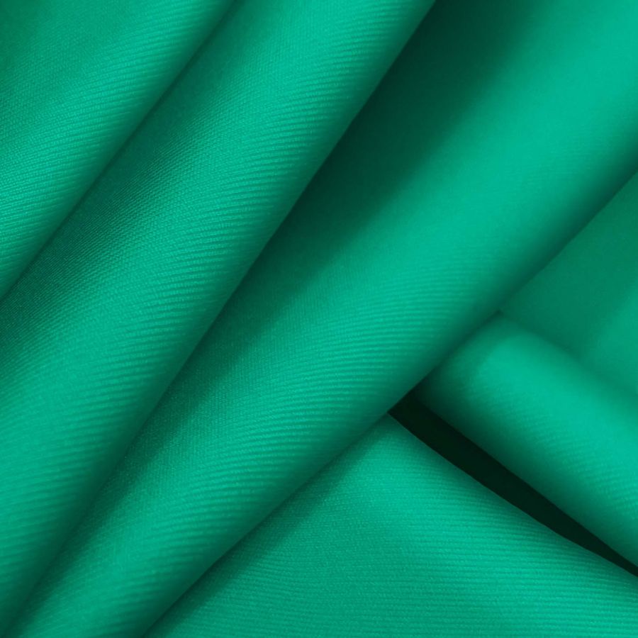 La Lycra Reciclada - Recycled es una tela elástica compuesta por un 85% de poliéster reciclado y un 15% de elastano, con un gramaje de 190 gr/m2 y una anchura de 150 cm. Su color liso impreso es un verde menta oscuro con una composición CMYK de 85 23 69 7, que le otorga un aspecto fresco y moderno. Este color combina especialmente bien con tonos claros y neutros, como el blanco y el gris.