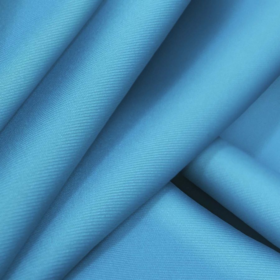 La tela base es Lycra Reciclada - Recycled de 190 gr/m2, compuesta por un 85% de poliéster y un 15% de elastano, con un ancho de 150 cm y gramaje de 190 gr/m2. El color liso impreso es un Azul Seda, con un CMYK de 72 34 2 0. Este color secundario transmite calma, elegancia y sofisticación, y combina muy bien con tonos arena, crema o marfil. Cabe destacar que la tela está impresa con el color liso a una sola cara por impresión digital textil.