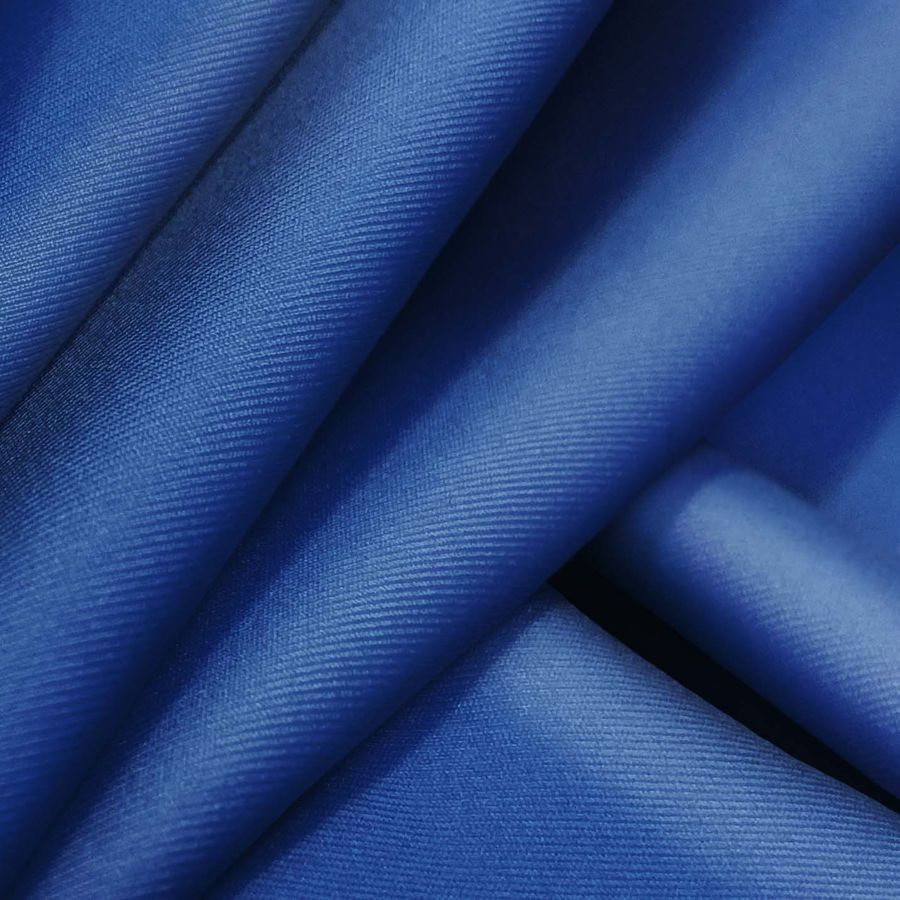 La tela base es Lycra Reciclada - Recycled de 190 gr/m2 en color azul denim oscuro, con una composición de 85% poliéster y 15% elastano. El color liso impreso presenta un CMYK de 100 81 14 2, lo que se traduce en un tono azul oscuro con una pizca de morado que lo hace más sofisticado. Este color secundario combina muy bien con colores neutros, como el blanco, beige y gris.