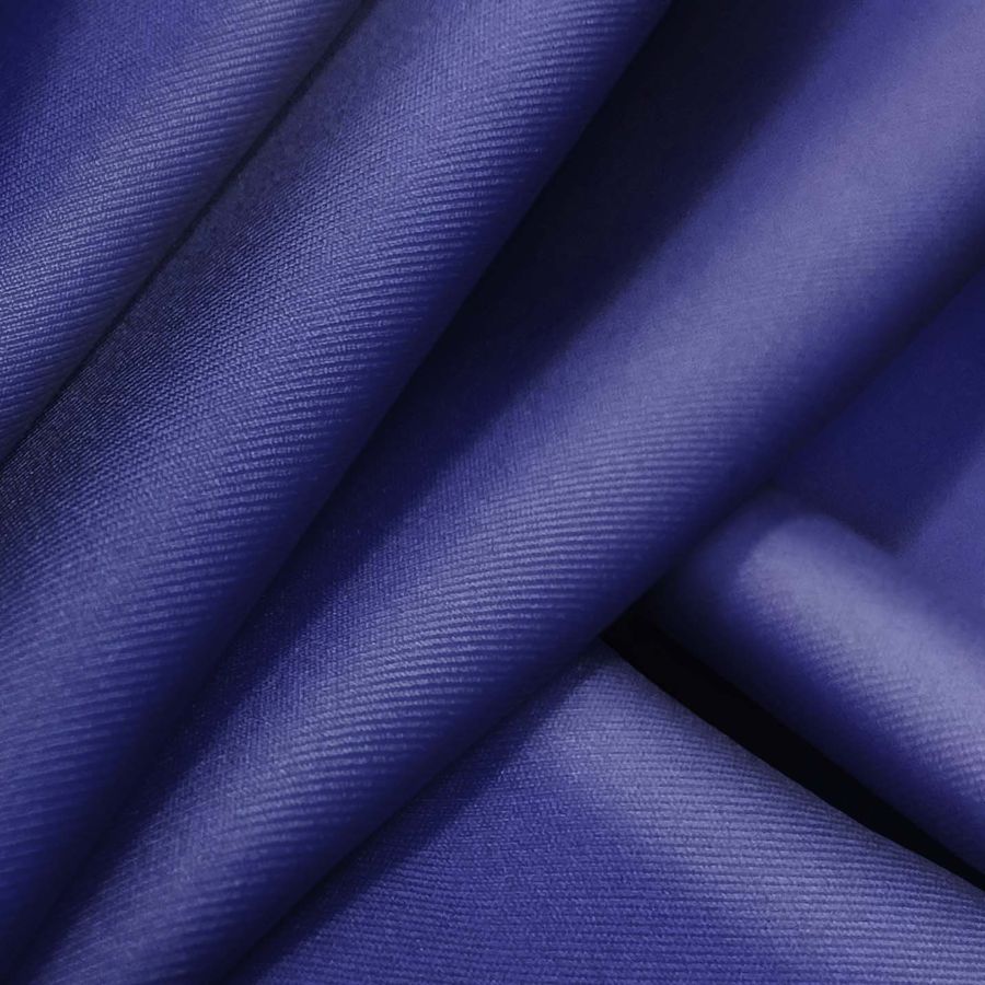 La tela base es Lycra Reciclada - Recycled de 190 gr/m2, compuesta por 85% de poliéster y 15% de elastano, con un gramaje de 190 gr/m2 y ancho de 150 cm. El color liso impreso es un tono de azul medianoche con un CMYK de 100 95 23 7, lo que indica que es un color intenso y oscuro con matices de morado. Este tono en particular combina muy bien con tonos fríos como el blanco, gris y rosa.