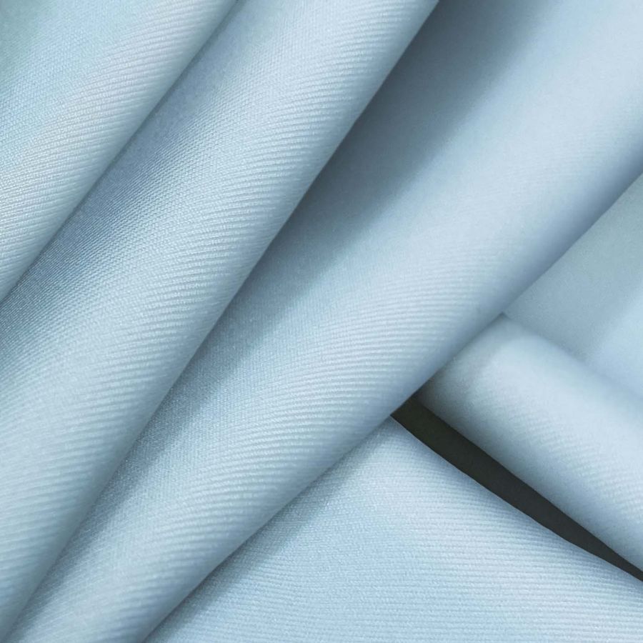 La tela base es Lycra Reciclada - Recycled de 190 gr/m2, compuesta por 85% poliéster y 15% elastano, con un ancho de 150 cm. El color liso impreso es Azul claro del día, con un CMYK de 40 8 2 0, combinación de tintas cyan, magenta, yellow y black. El color secundario es un azul claro y refrescante, que transmite armonía y tranquilidad, y combina bien con tonos neutros, blancos y grises. La tela está impresa con el color liso en una sola cara por impresión digital textil.