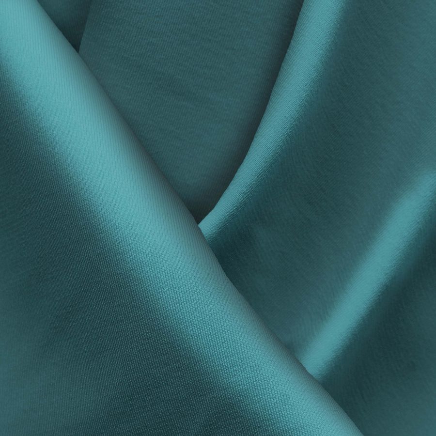 La tela base de este tejido es la Lycra Reciclada - Seal de 230 gr/m2, compuesta por un 75% de poliéster y un 25% de elastano, con una textura elástica y un acabado resistente al cloro y una protección UV Muy Alta de 50+. El color liso impreso en la tela tiene un tono de azul verdoso medio, con un CMYK de 80 40 47 29, lo cual indica que está compuesto principalmente de cian y amarillo, con toques de magenta y negro. Este color combina muy bien con tonos neutros como blanco, gris o negro, así como con otros tonos de azul o verde.