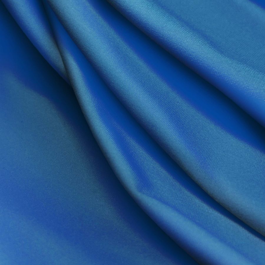 La tela base es Lycra Reciclada - Seal de 230 gr/m2, la cual está compuesta por un 75% de poliéster y un 25% de elastano. El color liso impreso es Azul/Azul marino púrpura, cuyo contenido de CMYK es 99 71 29 15. Este color secundario es profundo y elegante, es compatible con otros colores azules y se puede combinar perfectamente con el blanco, negro y gris. Cabe destacar que la tela está impresa con este color liso a una sola cara por impresión digital textil.