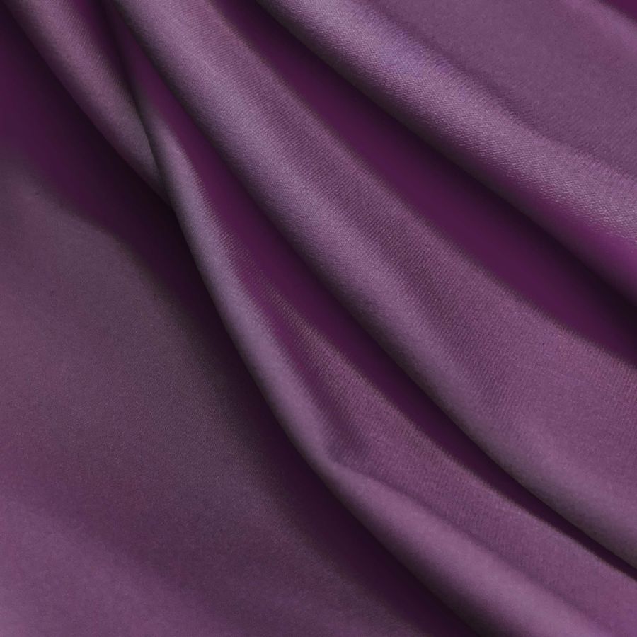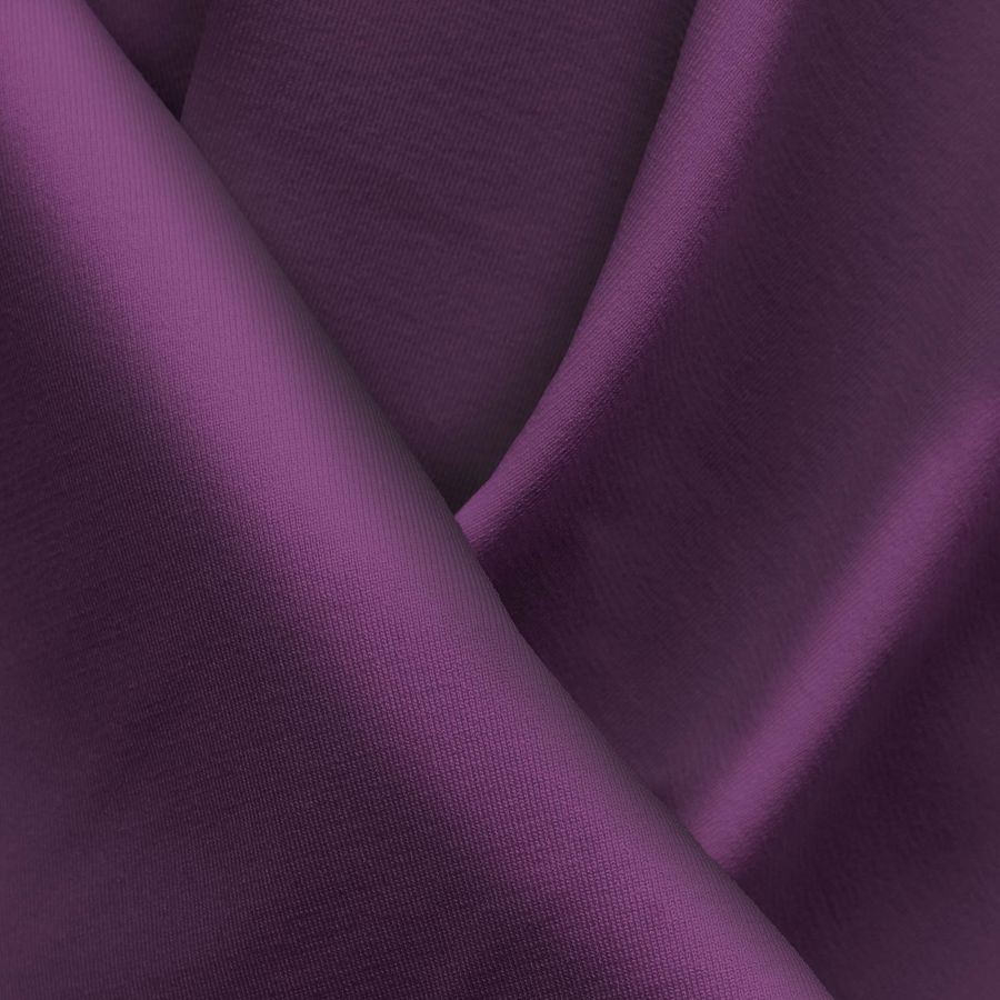 La tela base es Lycra Reciclada con un gramaje de 230 gr/m2, compuesta por 75% POLIÉSTER y 25% ELASTANO. El color impreso es Morado oscuro (CMYK 71 91 37 45) y se combina armoniosamente con tonalidades más claras de morado y violeta. La tela está impresa con el color liso a una sola cara por impresión digital textil. Entre las características generales, destaca su textura elástica y acabado resistente al cloro y con protección UV Muy Alta 50+. Las aplicaciones de uso son amplias, desde Lencería hasta Moda de Baño y Deportivo, incluyendo Bañadores, Mallas y Leggings. Los cuidados de la tela incluyen temperatura máxima de lavado de 40°C y planchado a temperatura fría. La tecnología de impresión utilizada es la Sublimación, que permite la fijación del color con un acabado duradero sin dejar residuos en la superficie de la tela.