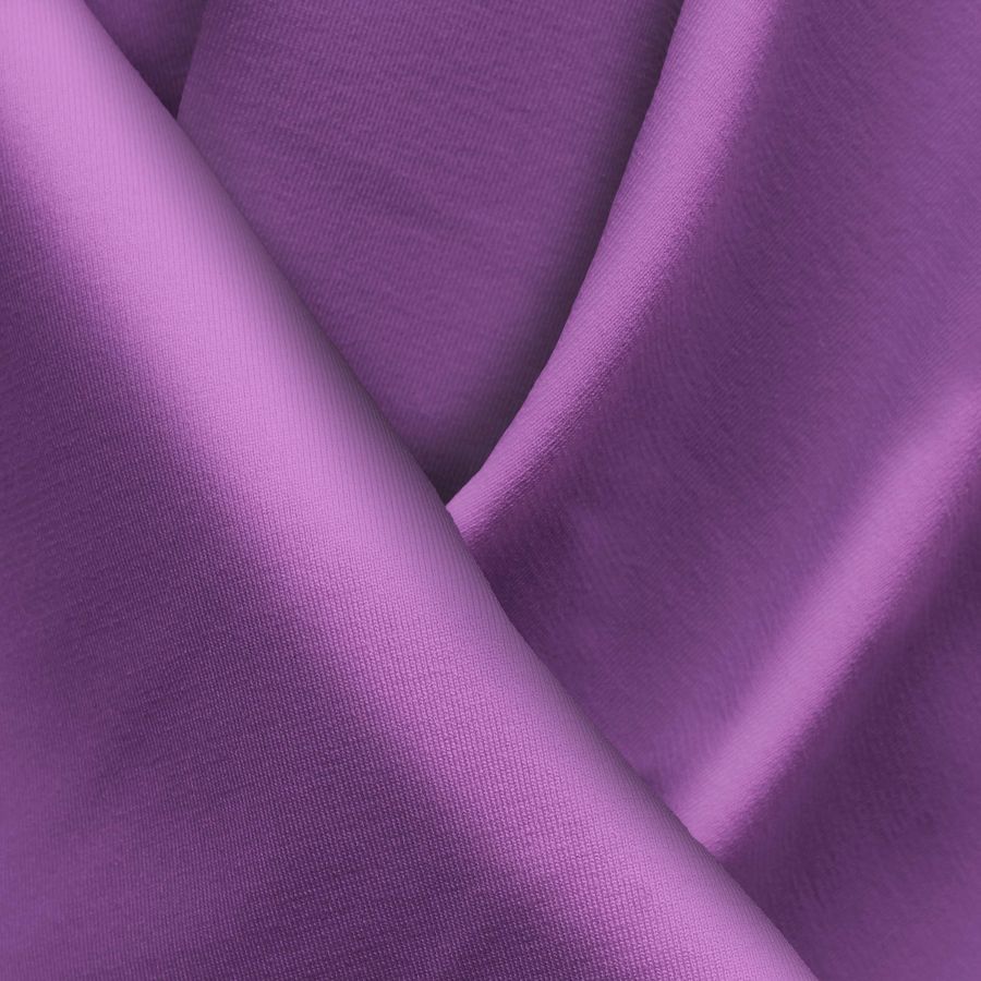 La tela base es la Lycra Reciclada - Seal, una Lycra compuesta por un 75% de poliéster y un 25% de elastano, con un gramaje de 230 gr/m2 y un ancho de 150 cm. El color liso impreso en la tela es Morado Iris, compuesto por la tinta Cyan en un 57%, la tinta Magenta en un 80%, la tinta Yellow en un 5%, y la tinta Black en un 0%, dando como resultado un CMYK de 57 80 5 0. Este color presenta una tonalidad morada con matices azulados y rosados, que combina especialmente bien con colores neutros como el blanco, el negro y el gris.