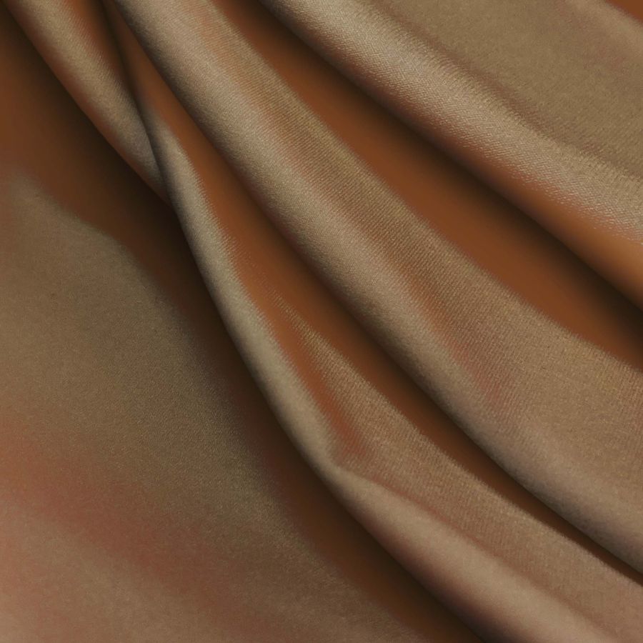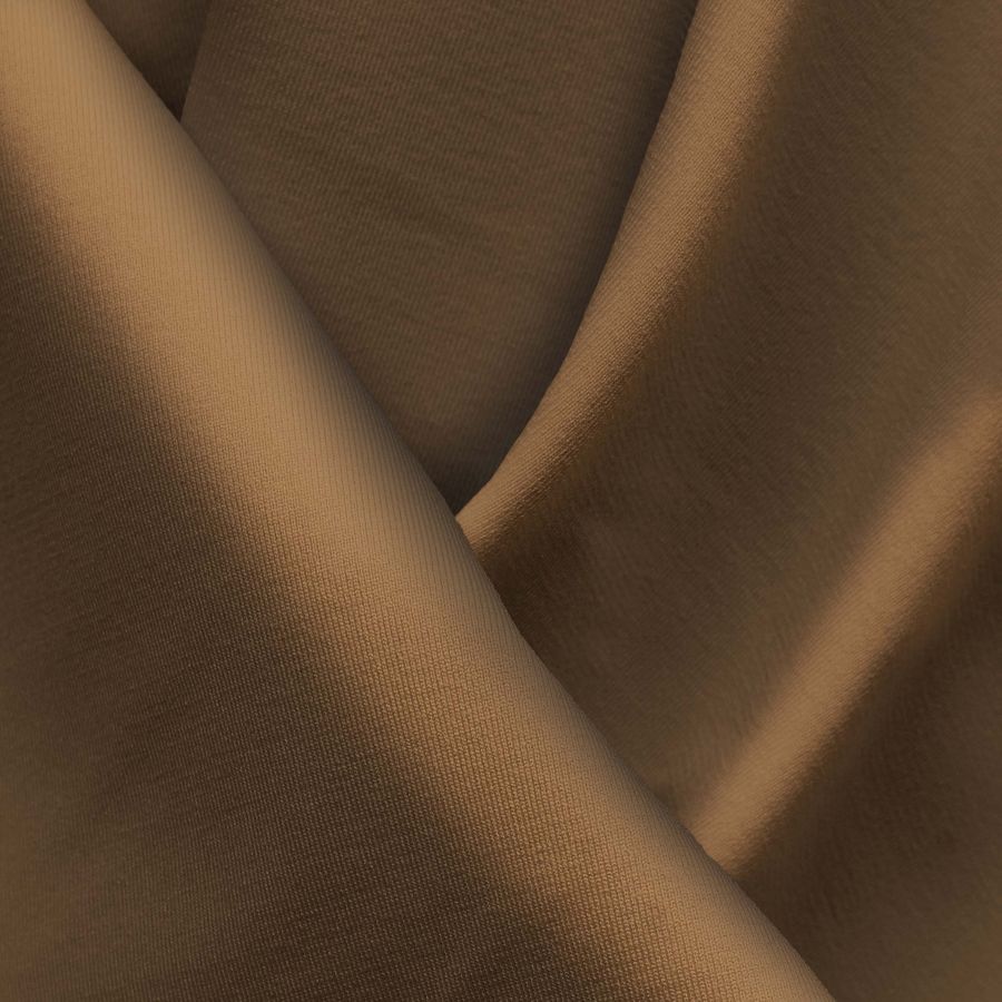 La tela base en cuestión es la Lycra reciclada de 230 gr/m2, compuesta por un 75% de poliéster y un 25% de elastano. El color liso impreso es marrón panadero, con un CMYK de 42, 59, 78, 55. Este color se describe como un marrón oscuro, elegante y sofisticado, que combina a la perfección con tonos neutros como el blanco o el negro y también con tonos más cálidos como el rojo o el dorado.