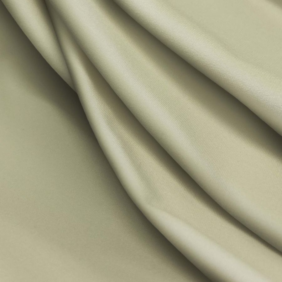 La tela base es Lycra Reciclada - Seal de 230 gr/m2, una lycra compuesta por 75% POLIÉSTER y 25% ELASTANO, con un gramaje de 230 gr/m2 y un ancho de 150 cm. El color liso impreso es verde camuflaje, representado por un CMYK de 32 24 48 7. Este color se caracteriza por su frescura y su espíritu juvenil, ideal para prendas deportivas y bañadores. Combina perfectamente con tonos neutros como el blanco, el negro y el gris, así como con tonos tierra y marrones.