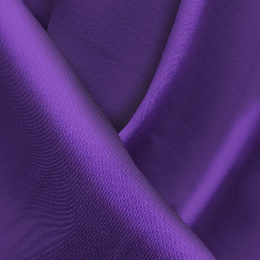 La tela base de este producto es la Lycra Reciclada - Seal de 230 gr/m2, una tela de tipo Lycra compuesta por 75% poliéster y 25% elastano, con un gramaje de 230 gr/m2 y un ancho de 150 cm. El color liso impreso tiene una combinación de Morado e Índigo con un CMYK de 87 100 12 3. La mezcla de estos colores secundarios nos muestra un tono púrpura intenso, que combina muy bien con tonos tierra y nudes, así como también con tonalidades de azul y verde.