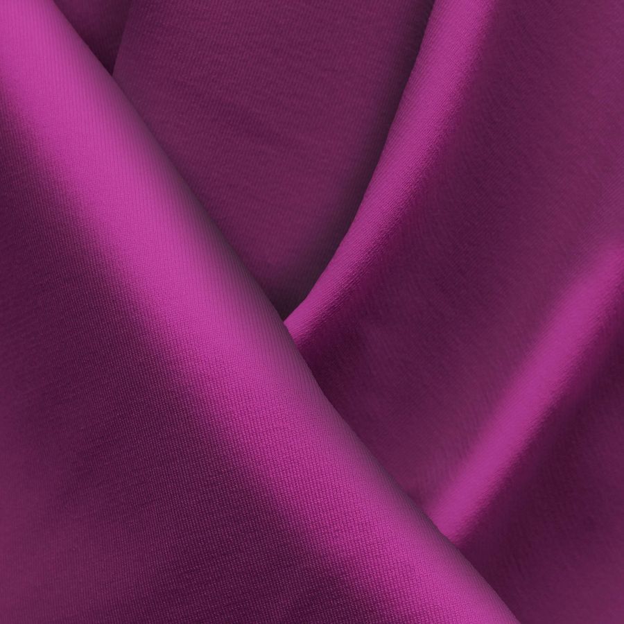 La tela base es Lycra Reciclada - Seal, con una composición de 75% poliéster y 25% elastano. El color liso impreso es Morado-Berenjena con un CMYK de 55 100 25 24. Es un color vibrante y profundo, que combina muy bien con tonos neutros como el gris o el negro. La tela está impresa con el color liso a una sola cara por impresión digital textil.