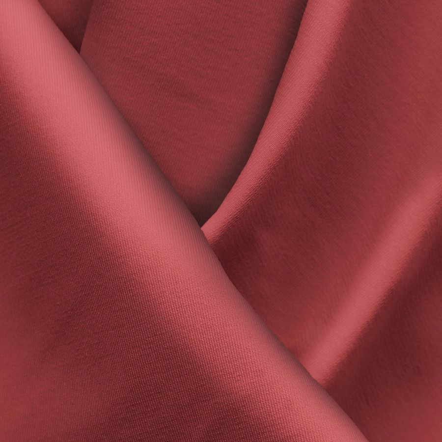 La tela base es Lycra Reciclada - Seal de 230 gr/m2, compuesta de un 75% de poliéster y un 25% de elastano con un gramaje de 230 gr/m2 y un ancho de 150 cm. En cuanto al color liso impreso, su CMYK es 26 87 70 22, lo que se traduce en un rojo oscuro intenso. Combinado con otros colores, se puede utilizar en la moda deportiva o para baño, combinándolo con tonos como el negro y el gris para crear un contraste sofisticado.