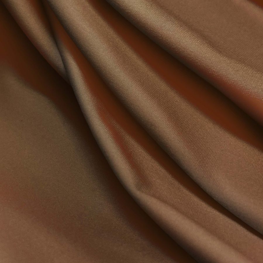 La tela base es Lycra Reciclada - Seal de 230 gr/m2, una lycra compuesta por 75% poliéster y 25% elastano, con un gramaje de 230 gr/m2 y un ancho de 150 cm. El color liso impreso es marrón oscuro, con una combinación de tintas Cyan 43, Magenta 70, Yellow 91 y Black 64, que en conjunto dan lugar a un CMYK de 43 70 91 64. El marrón oscuro es un color que representa la estabilidad, seguridad y confianza. Además, junto con el negro y gris, es un color que combina con casi todos los demás colores, destacando especialmente con el naranja, verde y colores tierra.