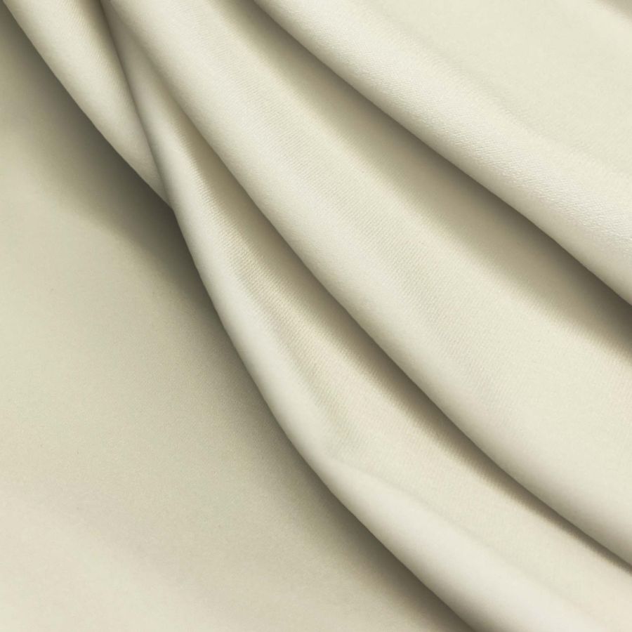 La tela base es una Lycra Reciclada - Seal de 230 gr/m2 de un ancho de 150 cm, compuesta por 75% poliéster y 25% elastano. Está certificada como sostenible por GRS y es resistente a la deformación y al paso del tiempo. El color liso impreso, Crudo Seda de maíz (CMYK: 4 5 28 0), se obtiene por sublimación y se aplica a una sola cara del tejido. Este color secundario, con ciertos matices amarillos, transmite suavidad y delicadeza, y puede combinarse con tonos tierra o neutros como el gris o el negro.