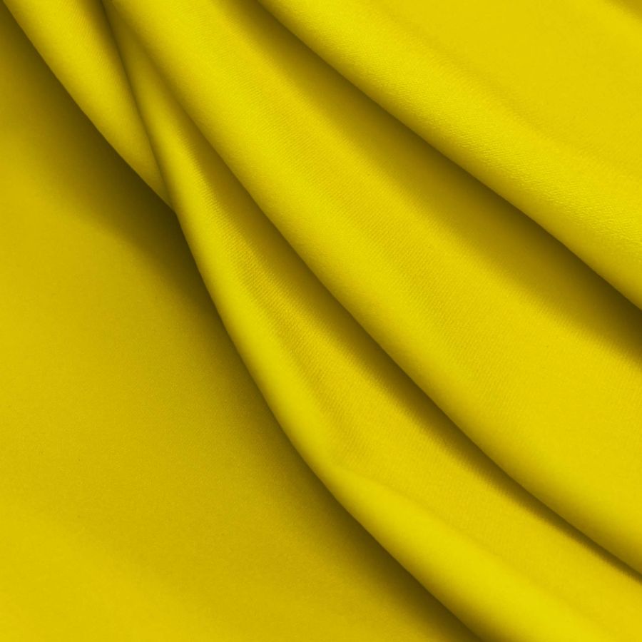 La tela base es Lycra Reciclada - Seal de 230 gr/m2, compuesta por 75% POLIÉSTER y 25% ELASTANO, con un ancho de 150 cm y una textura elástica y suave al tacto. El color liso impreso es un vibrante Amarillo profundo con un CMYK de 9 23 96 1, que combina especialmente bien con tonos neutros como el blanco o el gris. Es importante destacar que la tela está impresa a una sola cara por impresión digital textil, lo que le da una apariencia brillante y definida.