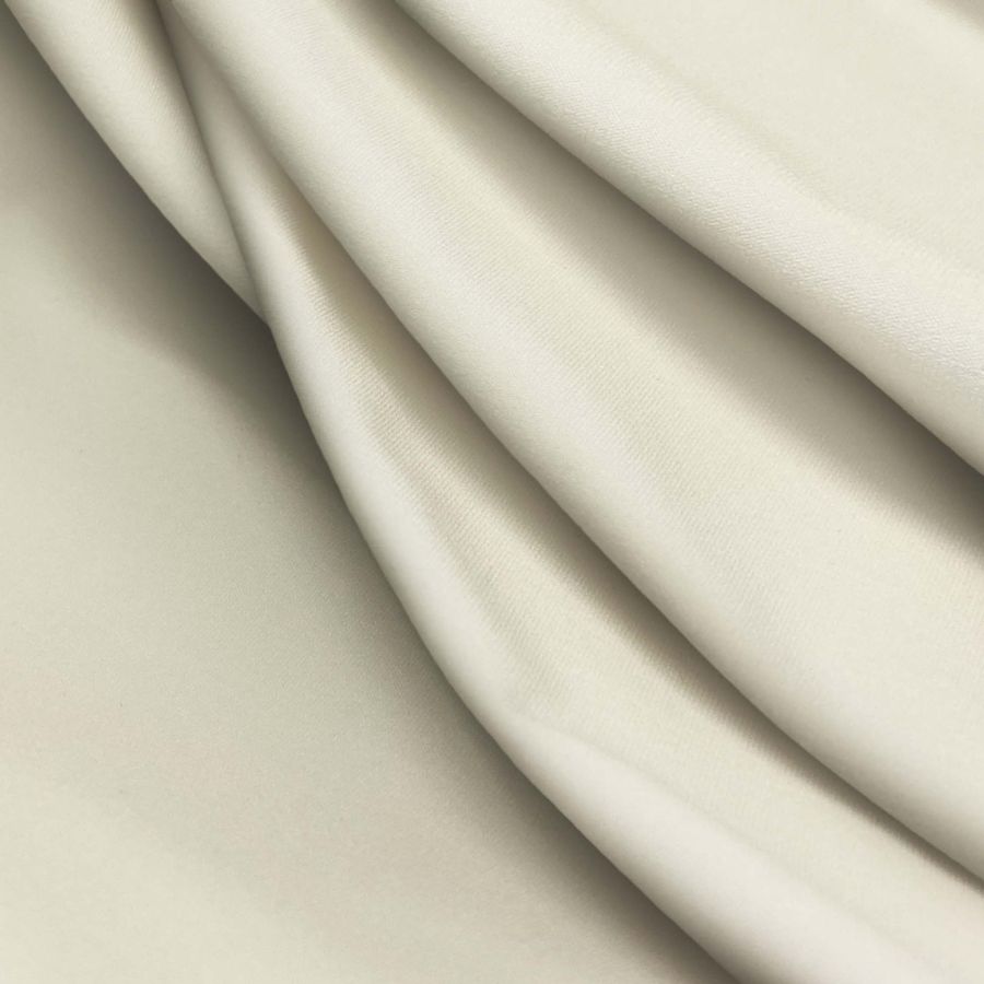 La tela base es la Lycra Reciclada Seal de 230 gr/m2, de composición 75% poliéster y 25% elastano, disponible en un ancho de 150 cm. En cuanto al color liso impreso, su CMYK es 4 6 23 0, lo que se traduce en un tono intermedio entre crudo y marfil suave, con un matiz amarillo verdoso. Combina perfectamente con colores neutros como el negro, blanco, gris y beige, y con tonos tierra como el marrón y el verde oliva.