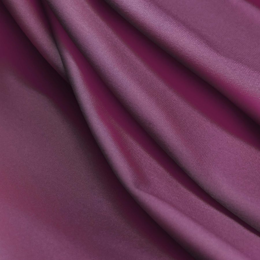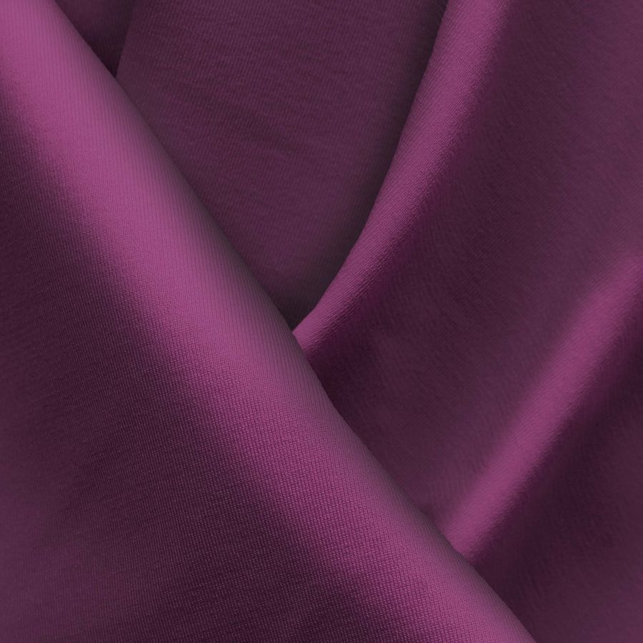 La tela base es una Lycra Reciclada - Seal de 230 gr/m2, compuesta por un 75% de poliéster y un 25% de elastano y con un ancho de 150 cm. El color liso impreso es un hermoso tono Morado-Berenjena, con un CMYK de 60 93 36 45, que se combina muy bien con colores como el blanco, el negro y el rosa palo. La tela está impresa con el color liso a una sola cara por impresión digital textil y no se trata de un tejido tintado.