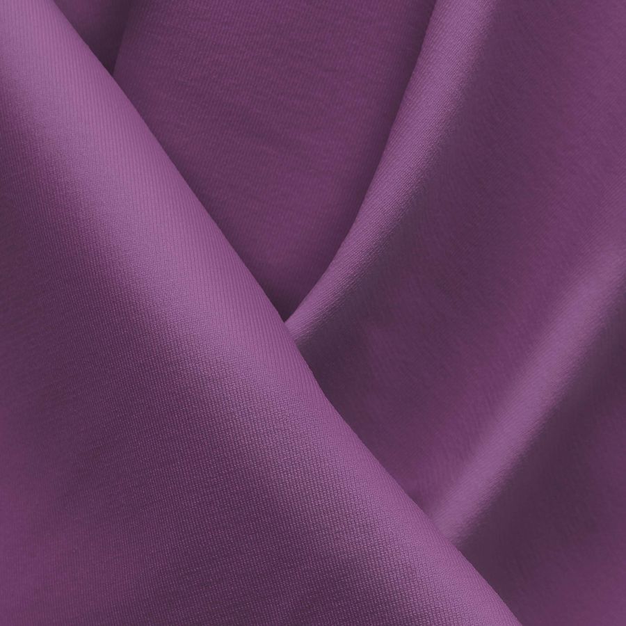 La tela base, Lycra Reciclada - Seal de 230 gr/m2, es una tela elástica y resistente compuesta por un 75% de poliéster y un 25% de elastano, lo que le confiere una textura suave y flexible, ideal para prendas de lencería, deportivas o de baño. Su color liso impreso en Morado y DarkOrchid está compuesto por una mezcla de tintas Cyan, Magenta, Yellow y Black en un porcentaje de 43, 69, 10 y 1 respectivamente.